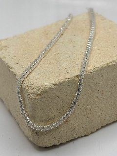 Este colar Riviera em prata 925 possui 40 cm de comprimento e 2 mm de largura, combinando delicadeza e sofisticação. Cravejado com zircônias que refletem a luz intensamente, é a escolha perfeita para quem busca um acessório clássico, versátil e cheio de charme para qualquer ocasião.